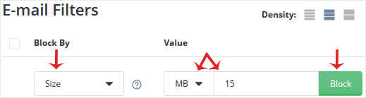 If you have chosen size in MB and have entered the value 5, all emails exceeding 5MB in size will be blocked.